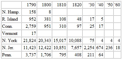 By the census of 1790, all the sixteen States then enumerated held slaves, except Massachusetts (then including Maine, although numbered separately), where the institution was abolished by a judicial construction of their constitution of 1780. The following table, from the census, shows the gradual disappearance of slavery from seven of these States, the remaining eight States still continuing the institution: