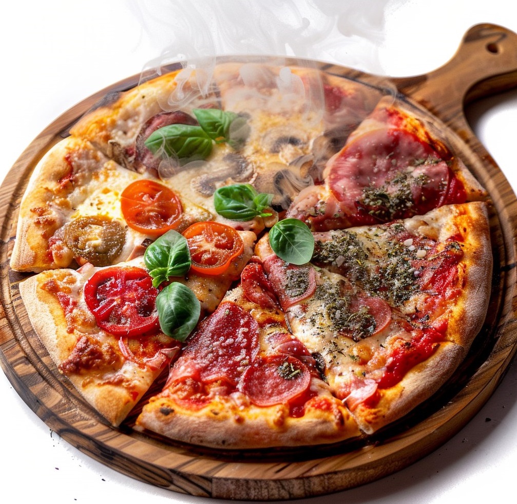 Разделение на четыре чётких части: Чтобы подчеркнуть тему четырёх сезонов, можно аккуратно разделить пиццу по диагоналям, создавая чёткие сектора. Это создаст контраст между ингредиентами, и визуально будет понятно, что каждый кусок символизирует конкретный сезон.