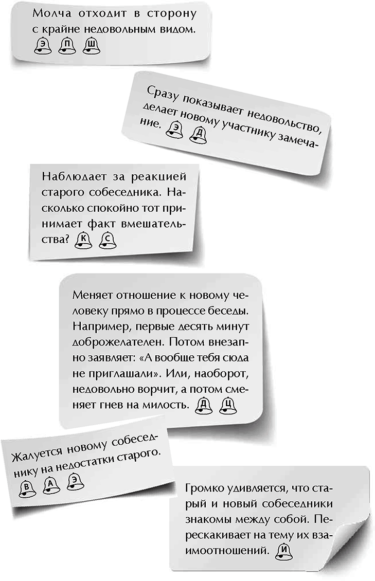 Наконец, более сложная ситуация. Ее трудно сконструировать, трудно получить случайно, трудно следить за всеми участниками. Почему? Потому что кроме подозреваемого требуются два персонажа. Один втягивает подозреваемого в доверительную беседу. Другой подходит и вмешивается в беседу самым бестактным образом. Что делает подозреваемый?