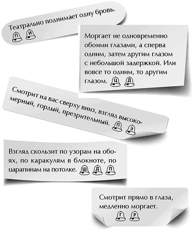 Начнем с простого. Взгляд. Куда смотрит подозреваемый? И что происходит с мимическими мышцами?