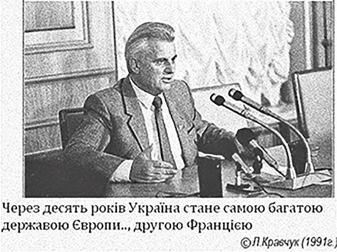 Для того чтобы стать «другою Францiєю» Украине, убеждал в 1991 г. украинцев Кравчук, нужно только освободиться от ига Москвы: «Украина – європейська держава – за можливостями, московська колонiя – за становищем». «Независимость Украины означает, – пояснял Кравчук, – что наша промышленность будет работать на потребности людей, а не обслуживать сверхдержаву. Учитывая, что республика производит 5 % мировой продукции, а ее население составляет 0,8 % жителей земли, независимость означает повышение благосостояния каждого гражданина»[6].