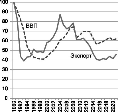 Одной из причин этого стал окончательный разрыв Украины с Россией, в результате доля СНГ в украинском экспорте сократилась с 50 % в 1996 г., до 12 % в 2019 г. (Гр. 4). Проблема падения экспорта отягощается для Украины сжатием ее собственного – внутреннего рынка: в 1993 г. его доля в ВВП составляла 74 %, а в 2016–2021 гг. в среднем 55–60 % ВВП[21].