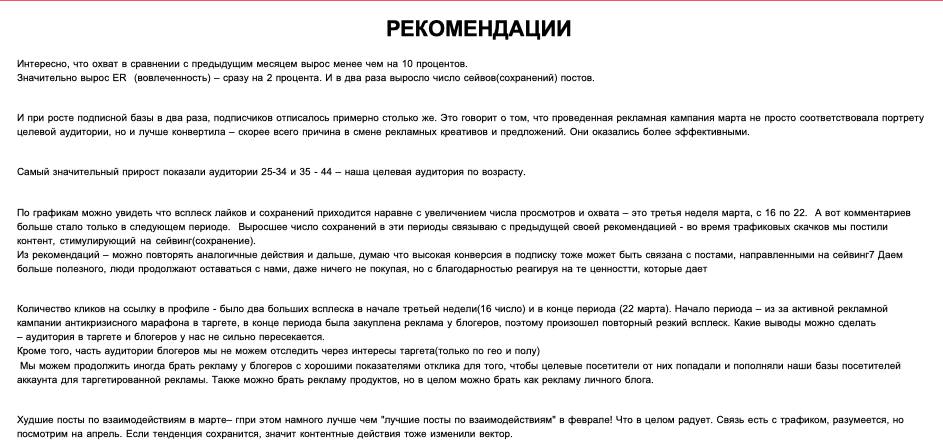 Пишете вы или создаете отчет по SMM, просто данных таблиц по направлениям работы недостаточно. Даже если вы все замерили и заполнили подробные таблицы данными статистики, цифры без интерпретации – ничто. Необходимо проанализировать полученные данные, сделать выводы об эффективности проведенных мероприятий и действий в аккаунте / на странице, дать рекомендации и скорректировать дальнейшие действия.