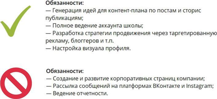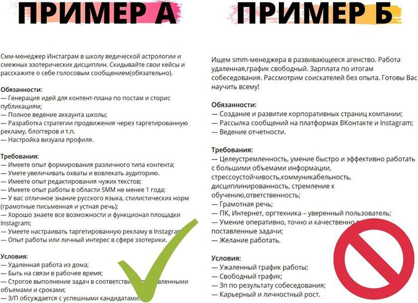 Обязанности. Пример А расписывает задачи SMM-специалиста: нужно делать контент для ленты и сторис, продумать стратегию рекламы через блогеров и поработать с визуалом. Пример Б размыт: нужно создавать какие-то страницы, рассылать сообщения в соцсетях и вести отчетность. Похоже на спам:-)