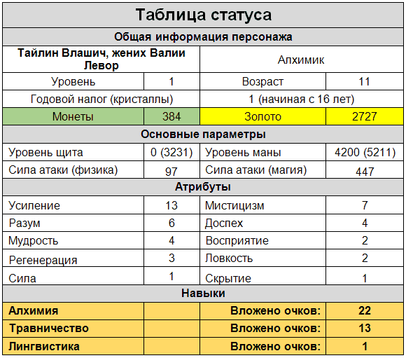 Броня оказалась совершенно бесполезной вещью. Продать и забыть. Зато кольцо и посох пришлись Тайлину по вкусу. Наконец-то у него появилось хоть что-то, чем можно приложить по голове. Открыв таблицу статуса, Тайлин посмотрел на изменения. С момента возвращения из «Города мертвых» их было не так и много, как хотелось бы. Но все же они были: