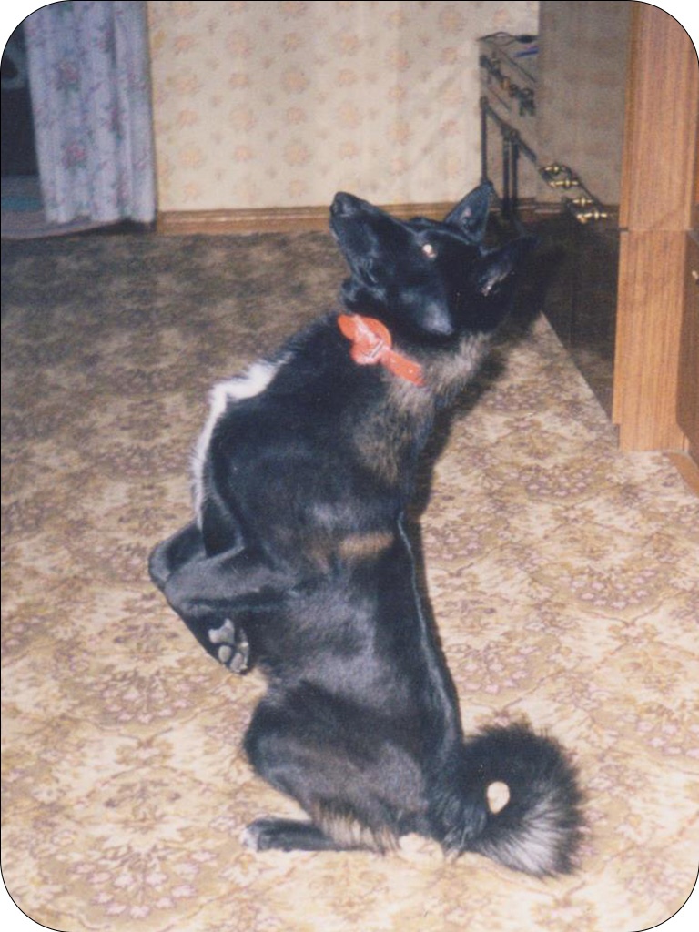 Люди фотографируются по настроению. Так же и Шурик! Первый раз, чтобы сфотографировать Шурика во время команды «СЛУЖИТЬ!», нам с братом пришлось стоять на спинке дивана, держа в руке кусочек колбаски над Шуриком, а он ради лакомства принял нужную нам стойку, и мама его сфотографировала, чтобы нас не было видно. После Шурик получил «награду» и убежал на место. Через время Шурка стал относиться к фото равнодушно и часто даже позировал для фотографии. Веселились мы – веселился он и свободно с нами фотографировался.