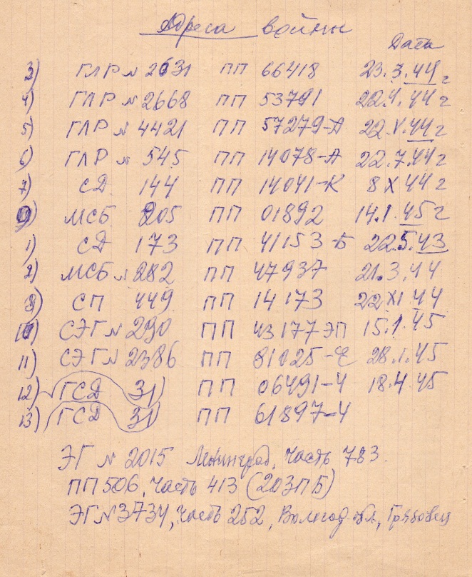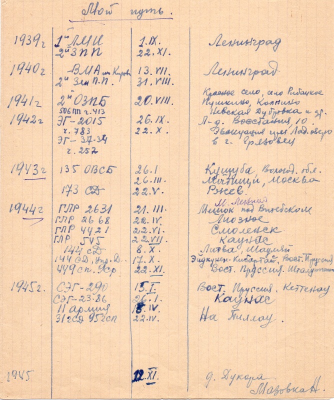 Так, можно увидеть, что он несколько раз лежал в госпиталях для легкораненых (ГЛР под номерами 2631, 2668, 4421, 545 и др.), в сортировочных эвакуационных госпиталях (СЭГ № 290, 2386 и др.), служил в 173-й, 144-й стрелковой дивизии. Упоминаются в его документе Мытищи, Москва, Ржев, пишет про «мешок под Витебском», Смоленск, Каунас, Шауляй (Литва), Эйдкунен, Кибартай, Кеттенау, Пиллау (Восточная Пруссия). Сейчас эти населенные пункты расположены в Литве и Калининградской области России.