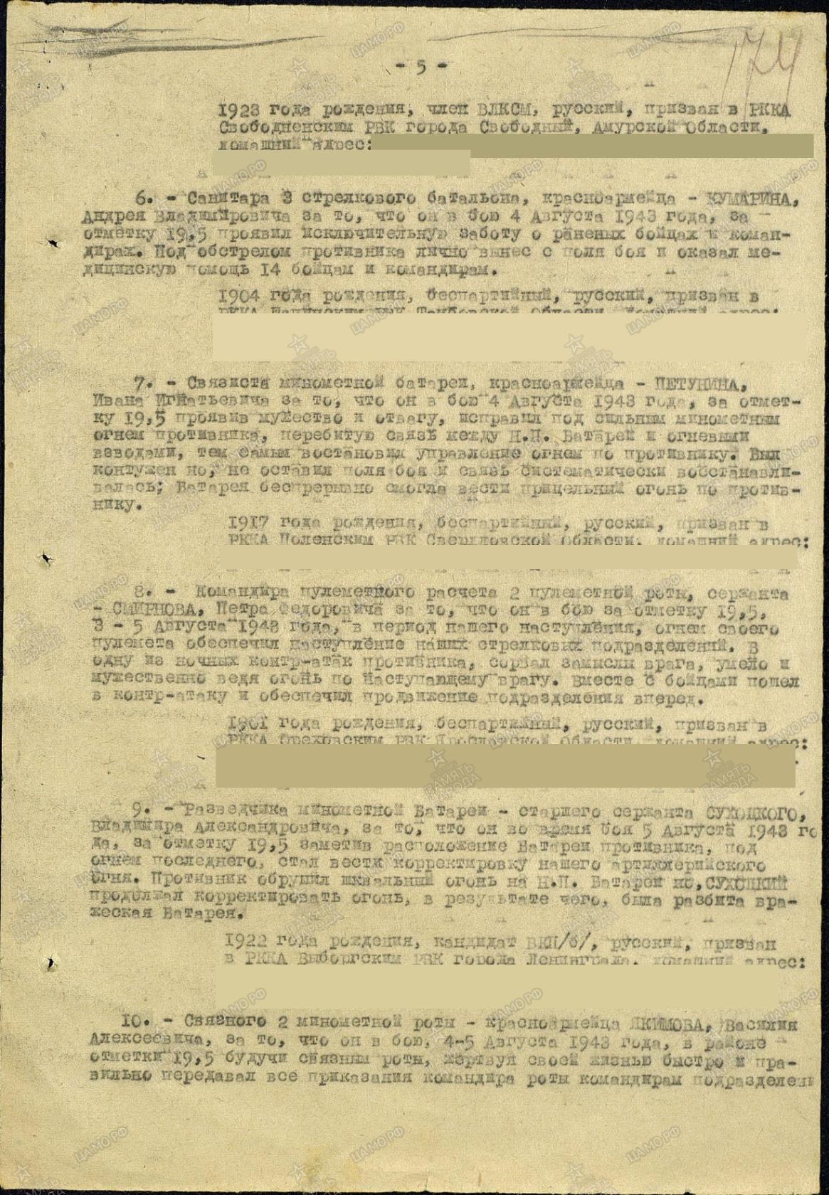 Прадедушка Петя пропал без вести. Моя тетя (Галина Анатольевна Титова) решила узнать в исторических архивах, что же с ним случилось, и мы нашли много интересной информации. Оказывается, мой прадедушка попал в 90-ую стрелковую дивизию, 286-ой стрелковый полк. И участвовал в прорыве блокады Ленинграда. Сначала мы думали, что он там погиб, т.к. была такая информация. Но оказалось, что это не совсем так. Но первый документ, который нам удалось найти – это документ о том, что прадедушке дали медаль за боевые заслуги («Медаль за 3-5 августа 1943 года»). И мы нашли описание того, что же произошло.