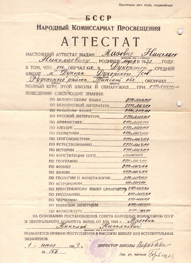 Мой отец, Мазовка Николай Николаевич (27.11.1920 – 04.10.1991), родился в селе Дукора Минской области, в Белоруссии, в многодетной семье. У него было 4 сестры и 3 брата. С отличием окончил сельскую школу и поехал в Ленинград учиться на врача.