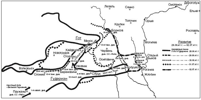 Танковые группы уверенно продолжили свой путь на восток, когда еще звучали последние выстрелы между Белостоком и Минском. 3-я танковая группа получила приказ отправиться из Минска на северо-восток, чтобы установить связь с правым флангом группы армий «Север» на Дюне (Западная Двина). А в то же самое время 2-я танковая группа должна была отправиться к Днепру.