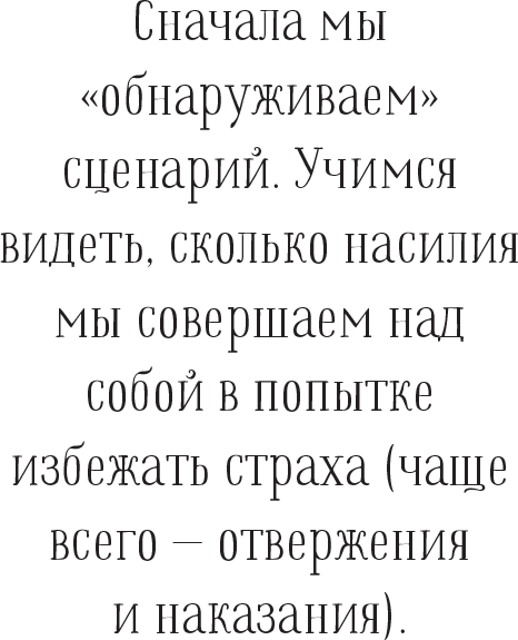 Сначала мы «обнаруживаем» сценарий. Учимся видеть, сколько насилия мы совершаем над собой в попытке избежать страха (чаще всего – отвержения и наказания).