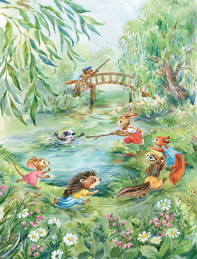 Друзья кричали во весь голос, звали на помощь и бежали вдоль берега за Борей. Впереди показался небольшой деревянный мостик. Неожиданно раздался хруст веток – и на берег выскочил большой бобёр. Он услышал зов зверят, сразу понял, что случилось, и ринулся на помощь. Схватив большую длинную палку, бобёр поспешил к мосту, к которому течение несло барсука.