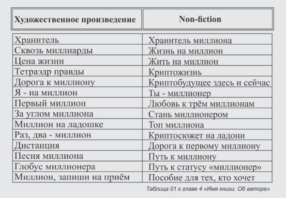 Допустим, для примера, наша идея – написать произведение, как пособие для начинающих миллионеров. С жанром пока определённость только в намётках, как non-fiction, но хочется что-то приукрасить художественно, а где-то и придумать, поэтому названия прописываем в двух колонках – для художественного произведения и произведения non-fiction (будем использовать и русское его написание, как «нон-фикшн»):