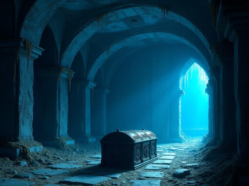 Зал явно был создан в незапамятные времена. Серебристые паутины свисали со стен подобно древним гобеленам, а каменные колонны, поддерживающие свод, покрывали загадочные узоры, похожие на письмена давно забытого языка. В центре возвышался массивный сундук. Его крышку избороздили трещины, металл потускнел от времени, но сама форма и витиеватые узоры выдавали в нём творение древних мастеров.