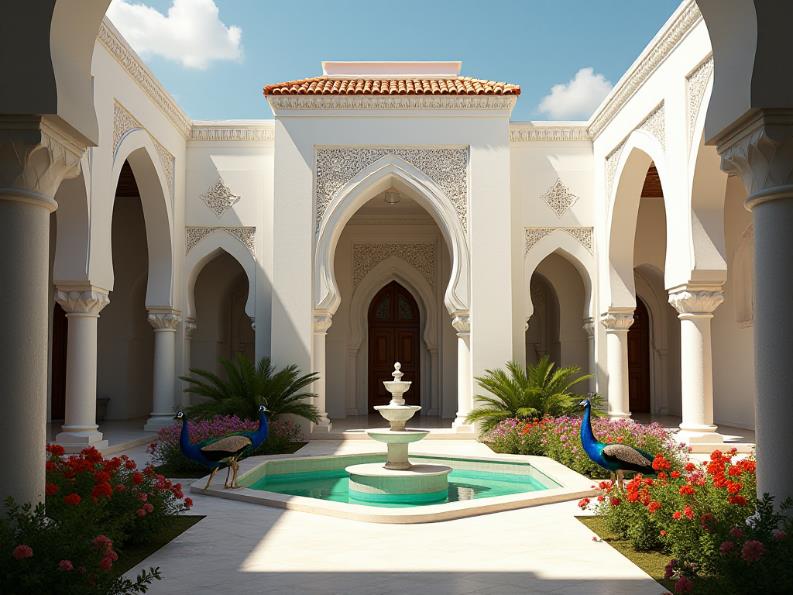 Резиденция шейха оказалась настоящим произведением искусства, где древняя архитектура встречалась с современной роскошью. Ослепительно белые стены, украшенные тончайшей резьбой и загадочными арабесками, обрамляли высокие арки, за которыми раскинулся внутренний двор с поющим фонтаном. Вода играла в солнечных лучах, рассыпаясь мириадами брызг, а вокруг цвели экзотические цветы, чьи алые и пурпурные лепестки казались каплями застывшего огня. По саду, словно живые драгоценности, неспешно прогуливались павлины, их хвосты переливались всеми оттенками изумруда и золота.