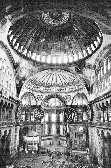 Внутренность Софийского собора поражала великолепием даже и в XVI веке, когда храм представлял собою груду развалин. Мраморные карнизы – более простые внизу и шире развитые вверху, решетка хор из орнаментированного камня и мозаичный пол еще уцелели.