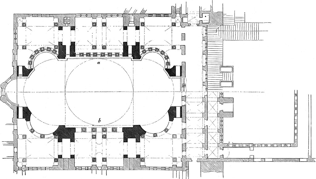 Этот собор представляет собою в плане обычный в Византии прямоугольник с тремя алтарными абсидами. У западной стены находятся хоры. Главный купол храма покоится на четырех столбах, между которыми, с севера и юга, устроены боковые хоры. Остальные четыре малых купола расположены в углах храма.