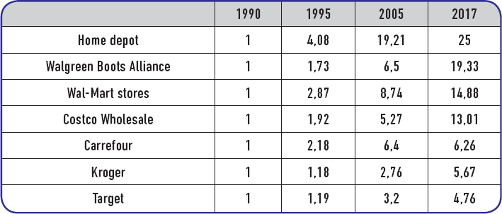 Вполне впечатляющая динамика. Некоторые компании выросли в двадцать раз за 27 лет. Однако Amazon.com увеличил продажи в 19,4 раза всего за 12 лет, с 2005-го по 2017 год. Home Depot, лидеру традиционной розницы по скорости роста, потребовалось для этого 25 лет. То есть лидеры цифровой экономики как минимум вдвое быстрее лучших традиционных компаний.