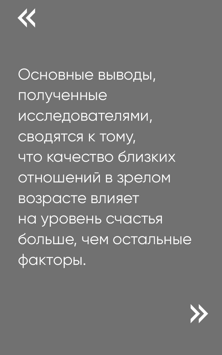 Самое длительное исследование развития взрослых людей началось в конце 1930-х гг. в Гарварде. Часть испытуемых набрали из 19-летних студентов Гарварда, часть – из молодых людей, проживавших в окрестностях Бостона. Целью исследования было наблюдение за состоянием здоровья и психологического благополучия этих людей в зрелом возрасте. Оно продолжается до сих пор и включило в себя уже второе поколение испытуемых. Исследование стало знаменитым после выступления его руководителя на TED под названием: «Что нужно для хорошей жизни? Уроки самого длинного исследования о счастье»{1}. Основные выводы, полученные исследователями, сводятся к тому, что качество близких отношений в зрелом возрасте влияет на уровень счастья больше, чем остальные факторы. Уровень интеллекта, наследственность, принадлежность к социальному классу не имели такого влияния на физическое и психическое здоровье, а также на уровень удовлетворенности жизнью, как качество близких отношений. Самые счастливые и здоровые люди были больше всего удовлетворены своими отношениями с окружающими, и особенно отношениями в браке. Удовлетворенность браком оказалась защитным фактором, позволяющим гораздо легче переживать соматические заболевания и боль в пожилом возрасте.