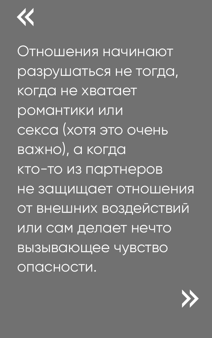 Что самое главное в отношениях в паре? Чувство безопасности и надежности – проще говоря, уверенность в том, что тебя не предадут. Отношения начинают разрушаться не тогда, когда не хватает романтики или секса (хотя это очень важно), а когда кто-то из партнеров не защищает отношения от внешних воздействий или сам делает нечто вызывающее чувство опасности. Очень часто к внешним опасностям относятся мнения, оценки, поступки родительской семьи – например, недовольство его партнершей или попытки обесценить ее.
