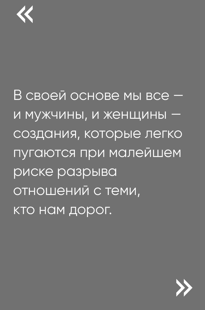 В своей основе мы все – и мужчины, и женщины – создания, которые легко пугаются при малейшем риске разрыва отношений с теми, кто нам дорог. Примеры «независимых» и «сильных» личностей, предпочитающих одиночество и свободу от эмоциональных связей, – лишь наращенная за годы жизни (а скорее всего, за первые пять–десять лет) защита от того ужаса, который может испытать любой, если чувствует, что его могут покинуть, забыть, предать, или когда это происходит в реальности. Единственная стабильность, к которой мы стремимся всю жизнь, – стабильность любви, будь то любовь родительская, романтическая или братская.