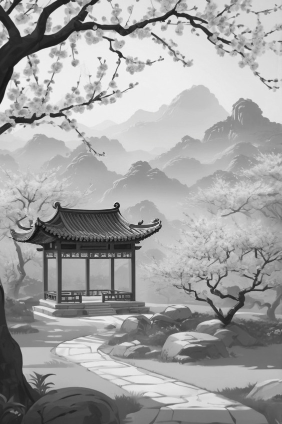 Теплый весенний воздух, напоенный ароматом цветения слив, обволакивал беседку. Смолистый запах сосен смешивался с запахом сливового цветения и легкой сыростью от ближайшего ручья. Где-то вдали кричала цапля – ее голос, похожий на скрип бамбуковой флейты, растворялся в вечерней тишине. По небу, окрашенному в цвета циньских шелков – розовато-золотистые у горизонта, лиловые над головой – медленно плыли белоснежные облака.