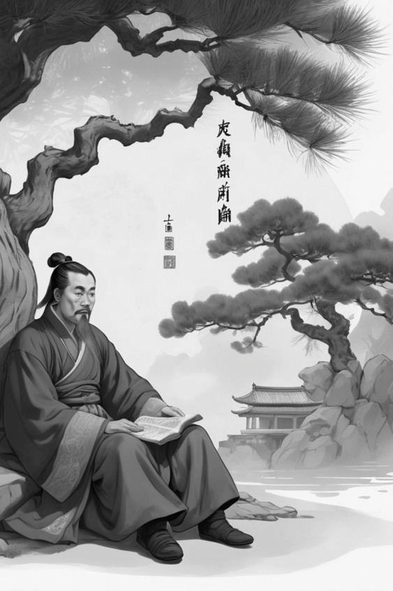 Взгляд у него был спокойный, но в этом спокойствии ощущалась проницательность, как у человека, привыкшего видеть и понимать суть вещей. Его темно-синий халат (пао) был скроен просто: узкий перекрестный ворот с застежкой под правую руку стягивался под горлом, широкие рукава были собраны у запястья, а завязки на плече едва удерживали ткань, сотканную из простого, но добротного шелка. Скромный покрой лишь подчеркивал изящество рук, привыкших держать свиток или кисть. Его волосы, собранные в небрежный узел, были перехвачены деревянной шпилькой, темная повязка на лбу защищала от солнца. За его спиной сквозь бамбуковую рощу проступал силуэт небольшого павильона.