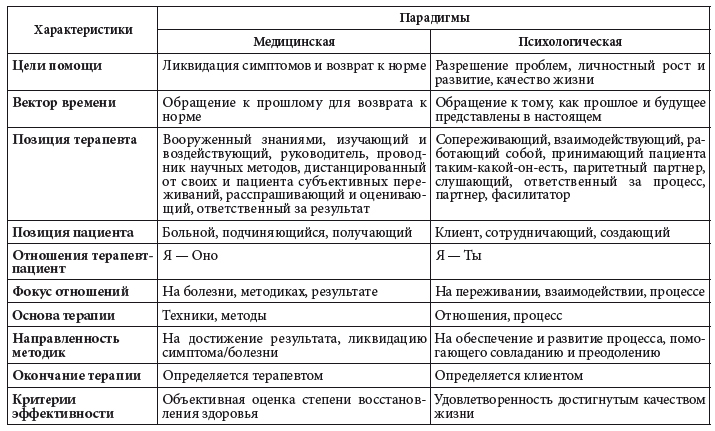 Но о какой, собственно, психотерапии идет речь? О той, из которой росла медицина (врач – от слова врати, то есть говорить и в первичном значении – прорицатель, колдун), или о той, которая выросла из медицины (лечебное воздействие на организм больного через его психику)? «История науки, – заметил Д. Гранин, – полезна уже тем, что отрезвляет и сбивает спесь с чересчур заносчивых потомков». Дегуманизированные, потерявшие человека медицина и психология сегодня возвращаются к человеку в его бытийности. Отношение к мечтам 1970-х об экспансии психотерапии во внеклиническую среду (Кабанов, Карвасарский, 1978) зависит от того, что мы имеем в виду под психотерапией. Ход событий показывает, что удачнее говорить не об экспансии с выносом клинических методов за стены клиник, а об ответе на запросы быстро меняющейся культуры, появлении и проявлении новой – психологической, немедицинской – парадигмы психотерапии (табл. 1).