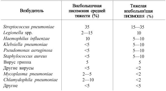 Если же отдельно оценивать этиологию внебольничных пневмоний средней тяжести и тяжелого течения, т. е. требующих чаще всего стационарного лечения, то превалирующим причинным фактором также является S. pneumoniae (15 – 35 %). Вторым по частоте агентом, по данным зарубежных исследований, является Legionella pneumophila, а в нашей стране второе место (около 10 %) занимает Haemophilus influenzae [Авдеев С. Н., ЧучалинА. Г., 2001]. Кроме того, при тяжелых внебольничных пневмониях в отличие от пневмоний легкой и средней степеней тяжести относительно большую долю возбудителей заболевания составляют Staphylococcus aureus, грамотрицательные бактерии, Klebsiella pneumoniae, Pseudomonas aeruginosa. Вирусные инфекции являются причиной 5 % всех тяжелых пневмоний, при этом основное значение имеет вирус гриппа. Вирусные пневмонии имеют сезонное преобладание, преимущественно в зимнее время. Имеются описания тяжелых случаев внебольничных пневмоний, вызванных М. pneumoniae и Ch. pneumoniae, однако в целом значение этих атипичных агентов при тяжелых пневмониях невелико.