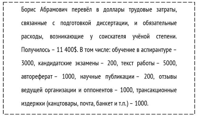 В любом случае диссертация того стоит. Как писал всё тот же Райзберг – «затраты… соизмеримы со стоимостью… автомобиля. Но учёная степень в отличии от автомашины не подлежит износу, способна служить её обладателю всю жизнь. А значительная часть расходов соискателя принимает форму его трудовых, а не денежных затрат».