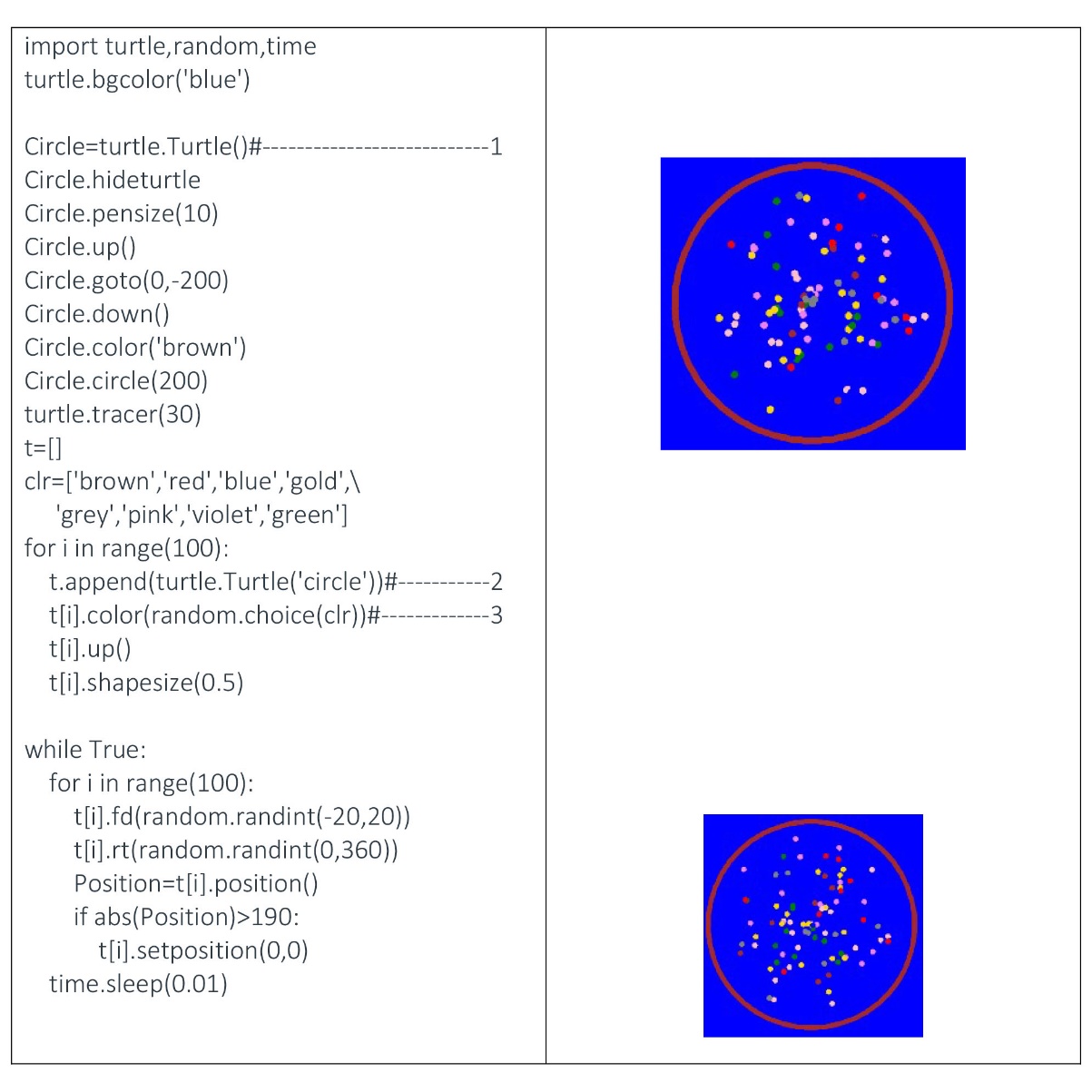 Интересным применением базовых примитивов черепашьей графики является пример случайных блужданий (перемещений) частиц при условии, что направление движение каждой частицы на каждом последующем шаге случайно, не зависит от предыдущего, является случайным с равномерной функцией распределения в угловом интервале (0-360 градусов). Случайное блуждание частиц ограничено кругом с заданным радиусом. Если частица приближается к границе круга программа перебрасывает ее в точку с координатами (0,0), откуда она вновь начинает хаотическое движение. Соответствующая программа показана в таблице 12. В правой части таблицы показано два статических кадра анимации.Программа работает следующим образом. Черепаший обьект Circle (строка #1) обозначает область в которой флуктуируют частицы. Каждая из 100-а частиц определяется обьектом t[i](i=0,1,2,3…99) и задана в виде круга (строка #2), окрашенного своим цветом (строка #3 ). Бесконечный цикл, в котором задается хаотическое движение частиц, введен в программу последними 7-ю строками.