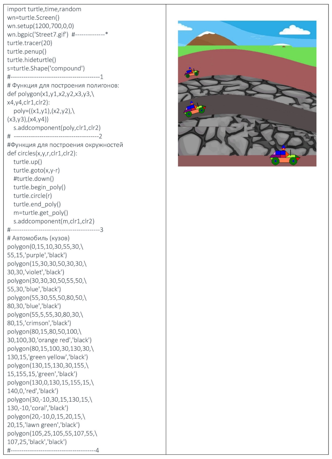 Коды между линиями 3 и 4, а также между линиями 4 и 5 определяют (с использованием библиотеки черепашьей графики) необходимые обьекты, которые затем используются в программе;
