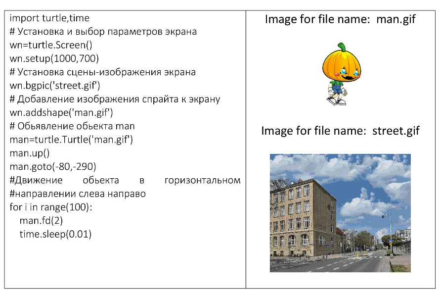 В приведенной программе 10 изображений человечка-памкина введены в программу 10-ю файлами в виде Python-list (image=[…]) и затем добавлены на экран с использованием команды wn.addshape(image[i]), где i пробегает значения от 0 до 9 включительно. Движение памкина осуществляется с помощью цикла (for m in range(60):). Целое число m1 пробегает только 10 значений ( 0,1,2…9), в то время как величина i изменяется от 0 до 60 включительно. При этом памкин проходит весь путь от левой части экрана до конца правой. Файлы с изображениями памкина, изображение улицы а также файл-программу можно скачать по адресу: