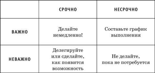 Правило 2: Беритесь прежде всего за важнейшие и срочные делаУправление временем – это вопрос не только самого времени, но и решаемых задач. Обычно 80 % времени отнимают дела маловажные, приносящие в копилку результативности дня не более 20 %. И наоборот, из 10 дел всегда найдутся два-три, осуществив которые вы уже будете довольны этим днем.