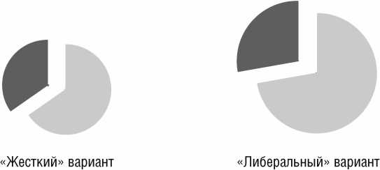 Здесь площади кругов означают всю получаемую прибыль, затушеванная часть – изымаемую в виде налогов. «Жесткий» вариант соответствует увеличению ставки налогов, «либеральный» – уменьшению ставки. Объем поступлений (площадь сегмента) во втором случае больше, чем в первом, хотя с каждого плательщика берут значительно меньше.