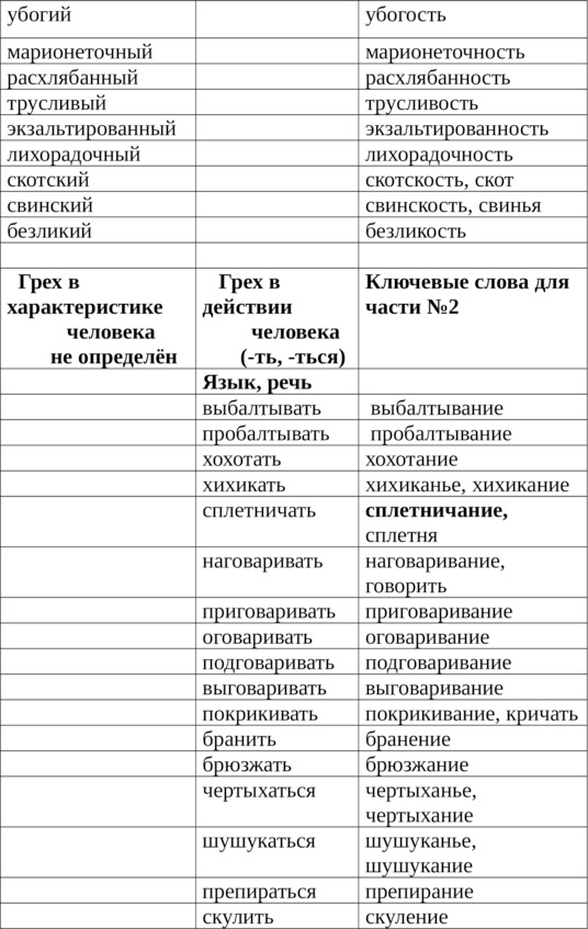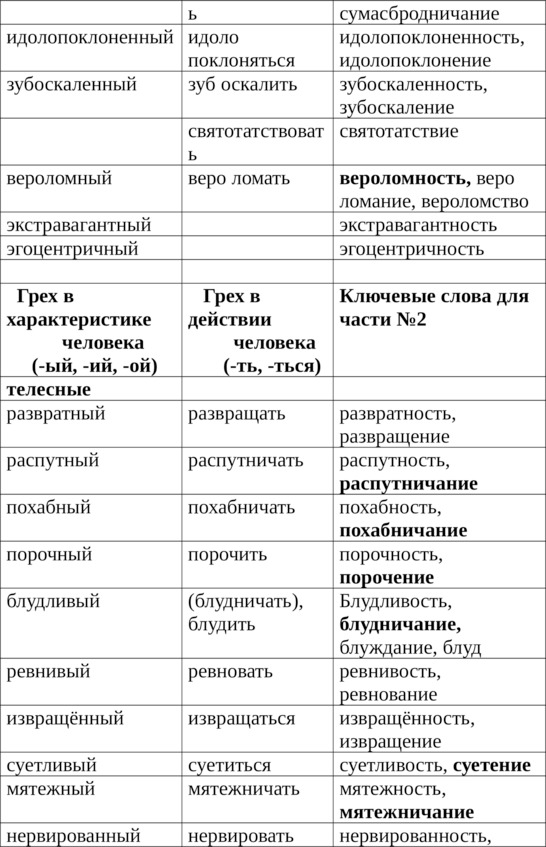 Начнём со слов называющих грех, так как они по иерархии ближе стоят к нейтральным словам.