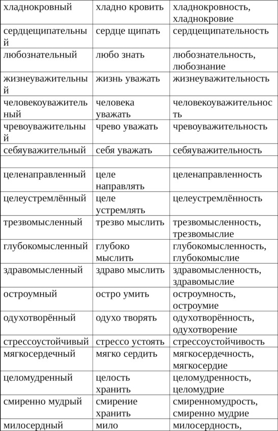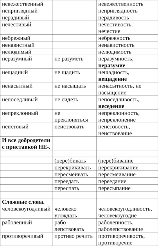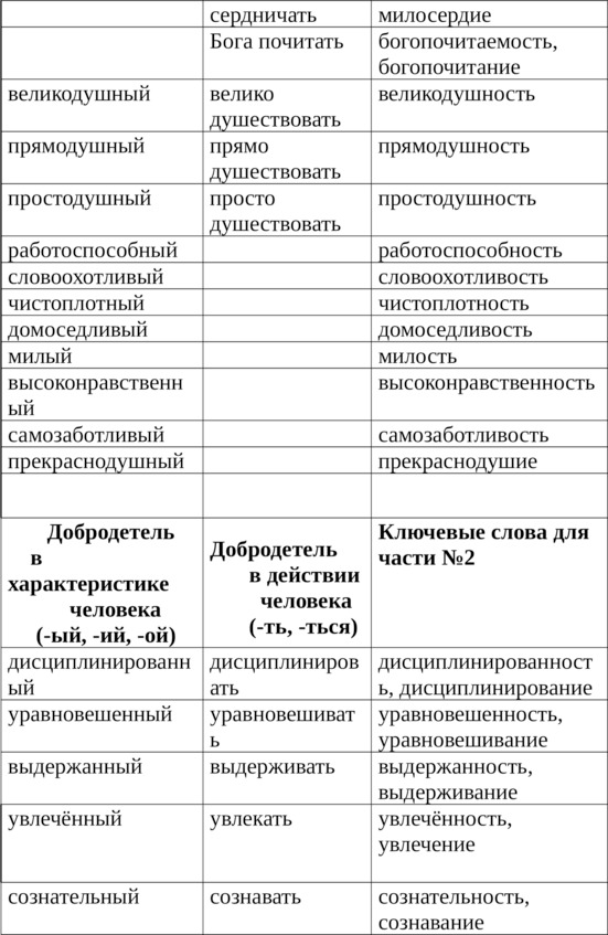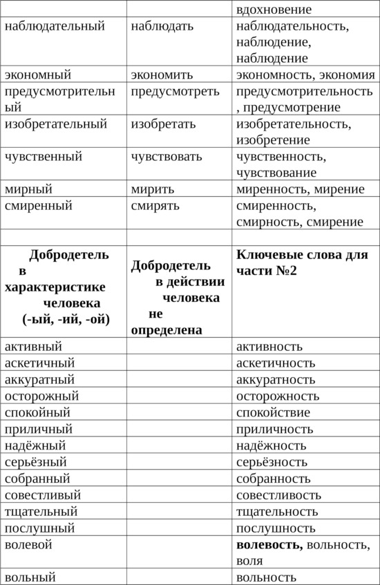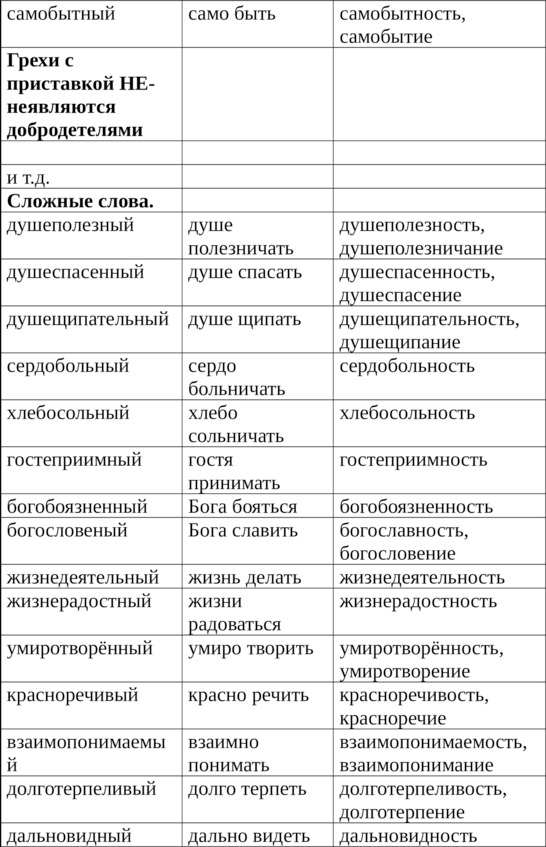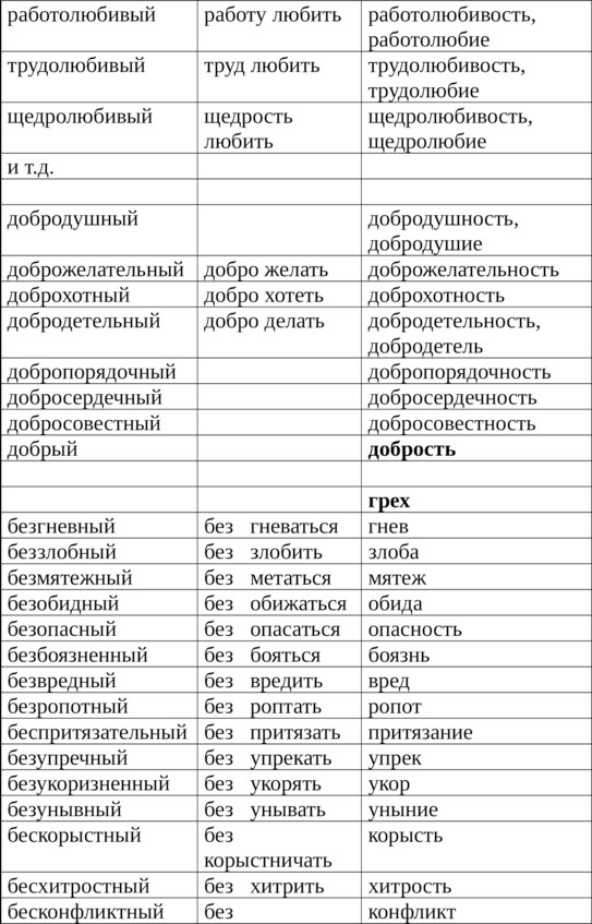 Слова определённых добродетелей часто не образуются от нейтральных слов, они порождение духовной сферы, они от Бога. Словообразовательные морфемы влияют на образование однозначной направленности нейтральных слов.