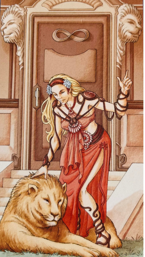 *На карте изображена красивая и сексуальная дрессировщица, а лев, как котенок, лежит у ее ног. Правой рукой она слегка придерживает льва, а левой рукой указывает вверх, что означает подключение интуиции и высших сил. Дверь за ее спиной закрыта, это говорит нам о том, что потребуются усилия и терпение, чтобы ее открыть, а ключ-это умение любые события мягко укрощать с любовью и настойчивостью.