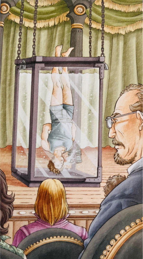 *На ней изображен человек, помещенный в куб с водой, при этом руки у него связаны и стоит он на голове. Судя по обстановке, изображенной на карте-это шоу, а потому кажется, что все не так страшно и серьезно. Человек ничего сделать не может, он просто ждет, когда закончится представление.