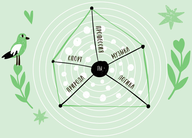 Соедини концы векторов линиями: получится такая «паутина», внутри которой будет поле твоих возможностей. В каком-то смысле это и есть ты: всё, в чём ты можешь и хочешь себя выразить. Представлять себе такое поле и действовать в нём – это и называется «становиться собой».