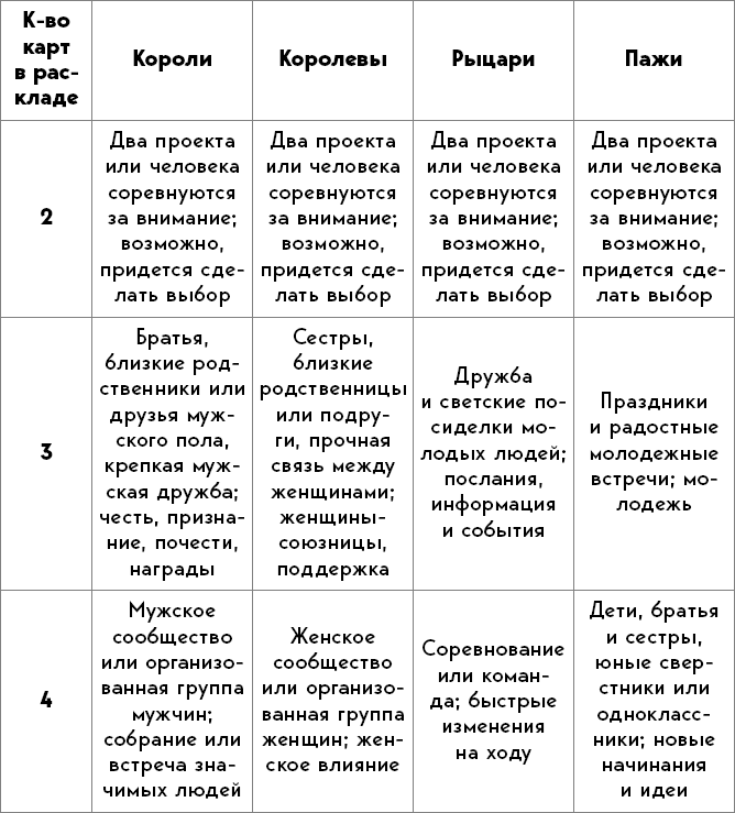 Придворные картыПридворные карты могут представлять людей или относиться к ситуации, окружающим энергиям и влияниям, сторонам личности и событиям. Вы поймете, что́ именно отображают карты, если сопоставите их значения с заданным вопросом и обстоятельствами. Например, три королевы в раскладе, связанном с духовным аспектом, могут указывать на поддержку проводников, предков или божественных союзников. Также полезно обратить внимание на масти, которые появляются в раскладе (см. табл. 1). Если вы получили Королеву мечей и Королеву кубков, это может указывать либо на баланс, либо на конфликт между умом и сердцем. Более точное толкование зависит от других карт в раскладе, заданного вопроса и кверента. В конечном счете ваша интуиция – самый мощный инструмент интерпретации смысла.