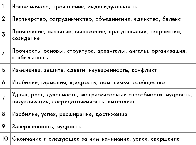 Одни люди считают, что каждое число обладает неотъемлемыми свойствами, другие, напротив, убеждены, что числа изначально не имеют какого-либо конкретного значения, а лишь представляют то, что вы им приписываете. Определенные числа могут что-то значить для вас, поэтому всегда следует доверять своей интуиции и руководству свыше. Тем не менее для каждого числа существуют широко распространенные ассоциации, которые указаны в таблице 2. Эти числовые соответствия могут вам пригодиться при интерпретации значений и символики Таро.
