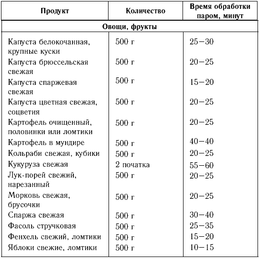 Ориентировочное время обработки продуктов паром приведено в таблице 1. Первоначально вам следует опираться на эти данные, однако затем, по мере накопления собственного опыта и с учетом своего вкуса, вы сможете устанавливать время приготовления того или иного блюда самостоятельно. Но это потом. Но сначала, когда вы только начинаете осваивать пароварку, удобнее следить за степенью готовности продукта, опираться на эти данные (не ошпарьтесь, пользуйтесь кухонными рукавицами!).