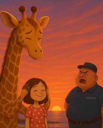 Каждый вечер Элла и её жирафчик выходили к воротам. Там, за линией ограды, не было домов, только бескрайняя дорога, ведущая в небо. Они смотрели, как горит небо, вспыхивая то малиновыми, то золотистыми всполохами, растекаясь нежной лавандой и остывающей лазурью. Воздух становился мягче, тёплый ветер шевелил волосы девочки, а Жюль, стоя рядом, медленно смежал веки, прикрывая их ресничками, будто тоже любовался этим зрелищем.