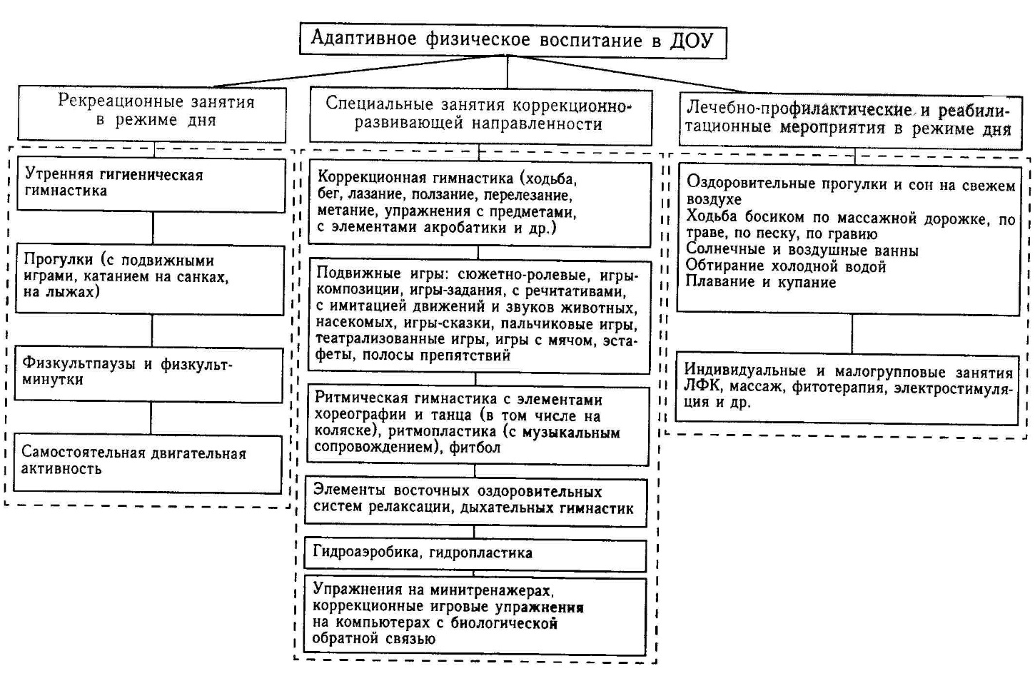 На рис. 1.1. в качестве иллюстрации представлена теоретическая модель адаптивного физического воспитания в дошкольных образовательных (коррекционных) учреждениях, его формы, направления коррекционноразвивающей работы и условия реализации. В каждой нозологической группе эти направления имеют собственные задачи, специфическое содержание, адекватный подбор средств, методов, методических приемов, соответствующих возрасту, условиям проведения занятий, типу учреждения [Л.В. Шапкова, 2007].