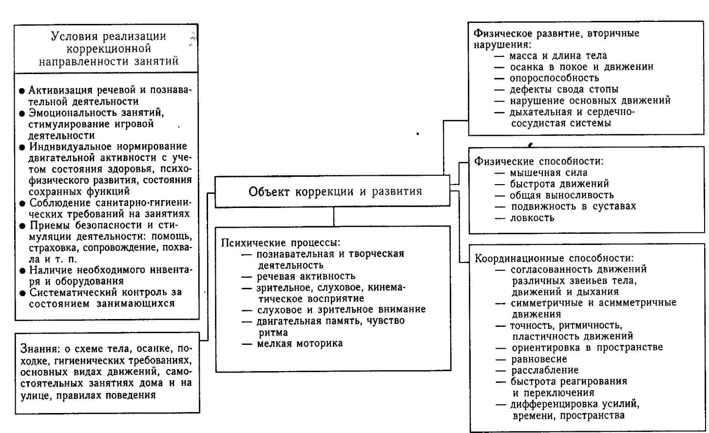 У всех детей с отклонениями в развитии имеет место та или иная моторная недостаточность, которая отражается на общем здоровье ребенка, снижает сопротивляемость организма к простудным и инфекционным заболеваниям, неблагоприятно влияет на развитие всех систем организма и нервно-психической деятельности. Поэтому развитие движений и коррекция двигательных нарушений составляют основу физического воспитания детей с отклонениями в развитии.