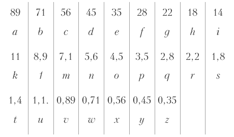 Мы заканчиваем наш ряд на 0,35, так как очень мало таких поверхностей, которые бы отражали света так мало или еще меньше. Теоретически можно продолжать этот ряд до бесконечности. Под числами находятся буквы латинской азбуки, которые обозначают ступени серого ряда, так же, как в музыке тона обозначаются буквами. Каждая буква может обозначать написанное над нею количество белого света (в процентах) или количество черного цвета, если возьмем число дополнительное до 100. Таким образом, буква i может означать 14 % белого цвета или 86 % черного. На практике для большинства случаев эти деления еще слишком мелки. Поэтому мы из каждых двух чисел опускаем одно и получаем практический серый ряд (шкалу бело-черного). Мы обрываем его на букве р, так как у буквы р находится самый глубокий черный цвет, который можно получить на бумаге при помощи типографской черной туши: