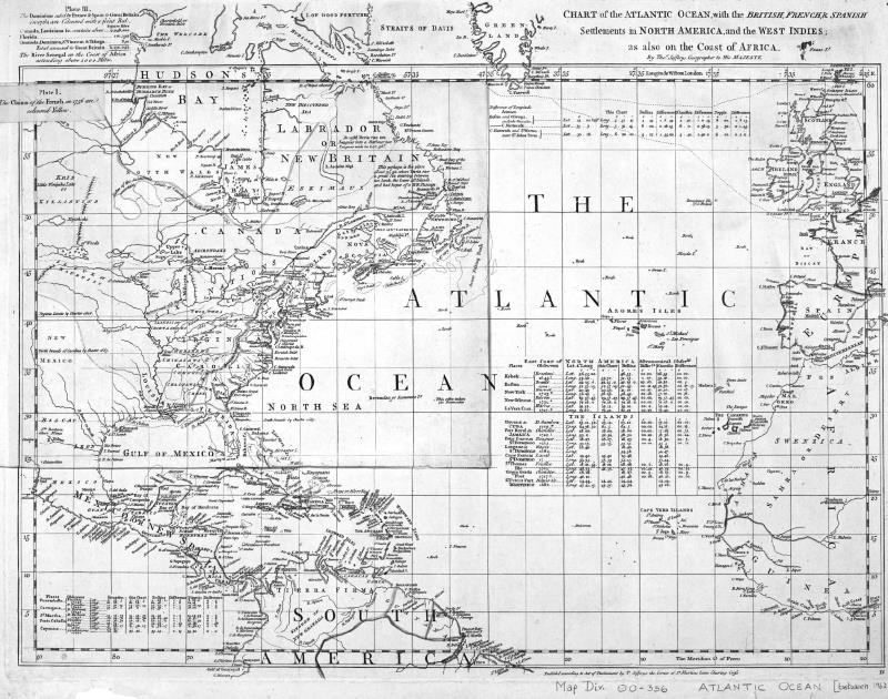 Томас Джеффрис. Карта Атлантического океана с британскими, французскими и испанскими поселениями в Северной Америке и Вест-Индии (1753)