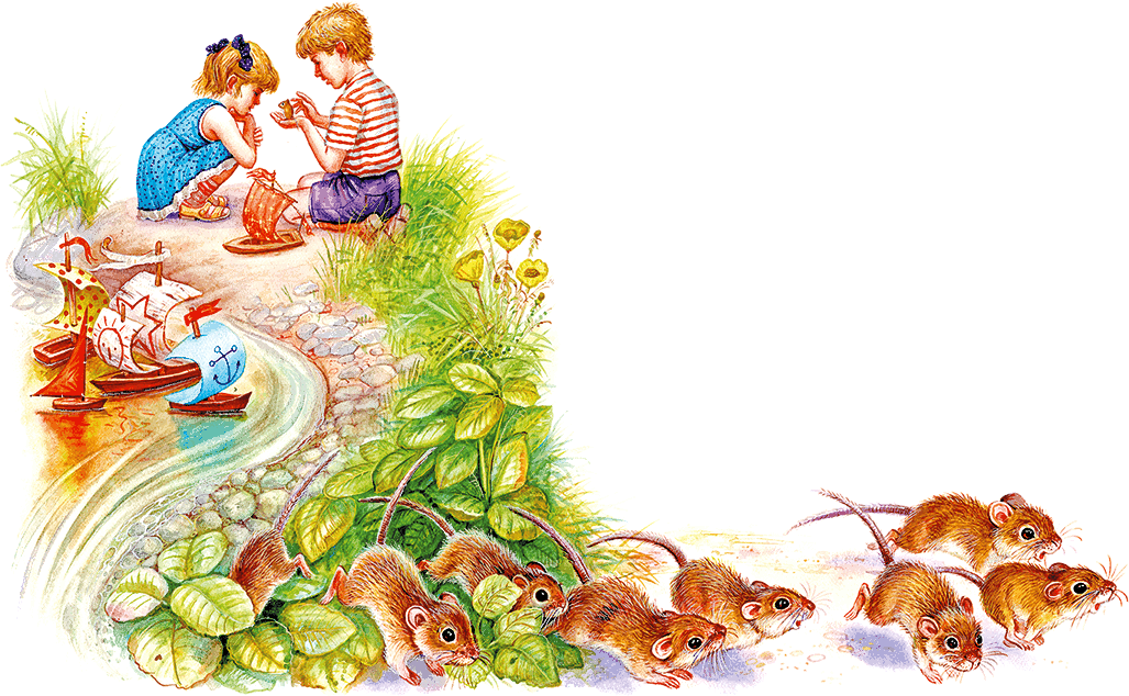 Как мышонок попал в мореплавателиРебята пускали по реке кораблики. Брат вырезал их ножиком из толстых кусков сосновой коры. Сестрёнка прилаживала паруса из тряпочек.