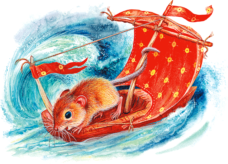 А мышонка несло да несло на лёгком сосновом кораблике. Ветер гнал судёнышко всё дальше от берега. Кругом плескались высокие волны. Река была широкая – целое море для крошечного Пика.